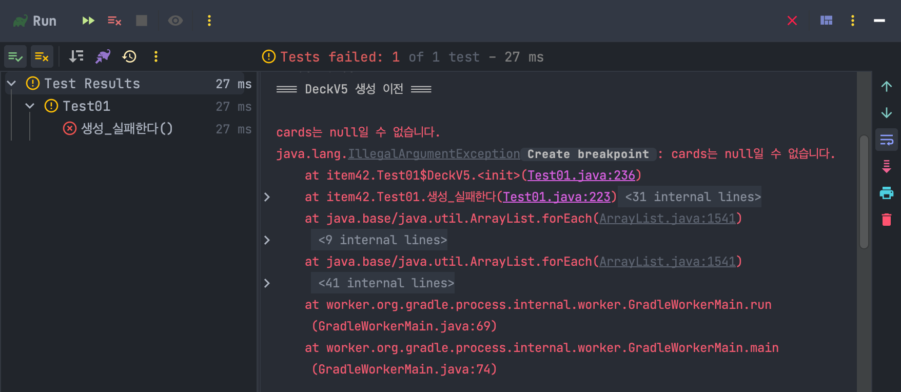 실행 결과는 DeckV5와 마찬가지로 생성하는 순간에 예외가 발생합니다.