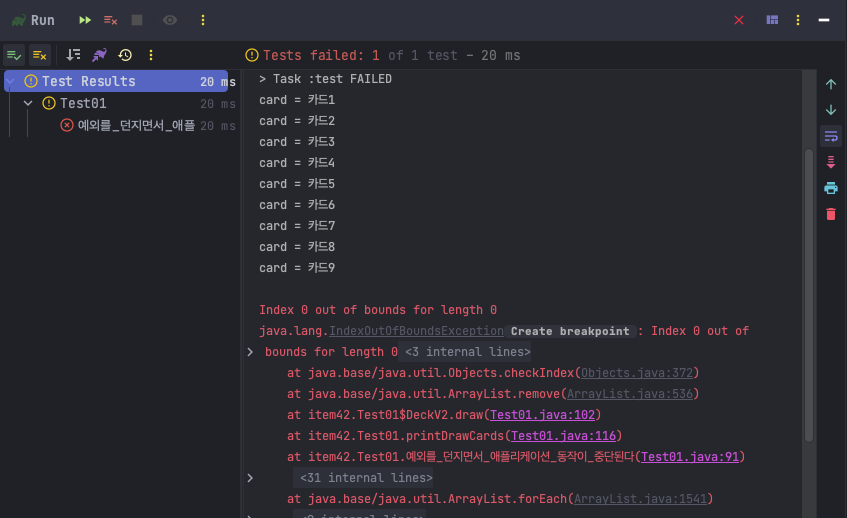 return cards.remove(0); // === 예외가 발생한다. ===