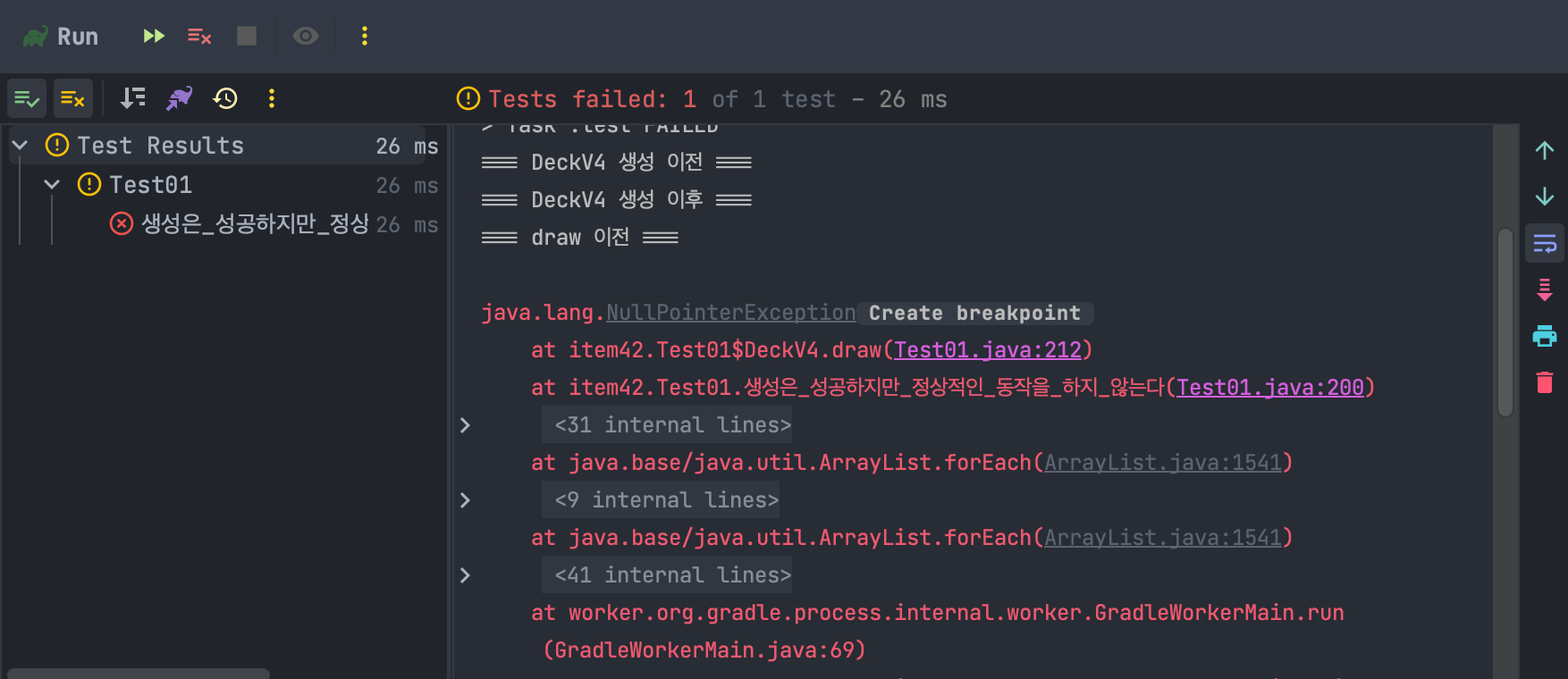 deck.draw(); // 앞단에서 생성 실패하여 메서드가 호출되지 않는다.