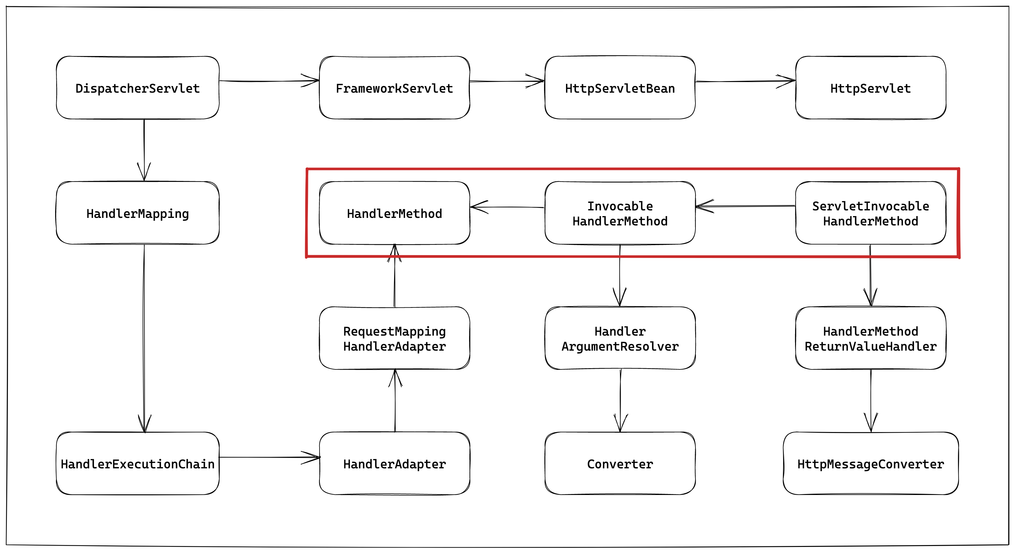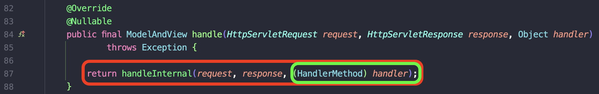 handle() 메서드의 세 번째 인자로 넘겨준 HandlerExecutionChain을 HandlerMethod로 형변환한 것을 볼 수 있다.