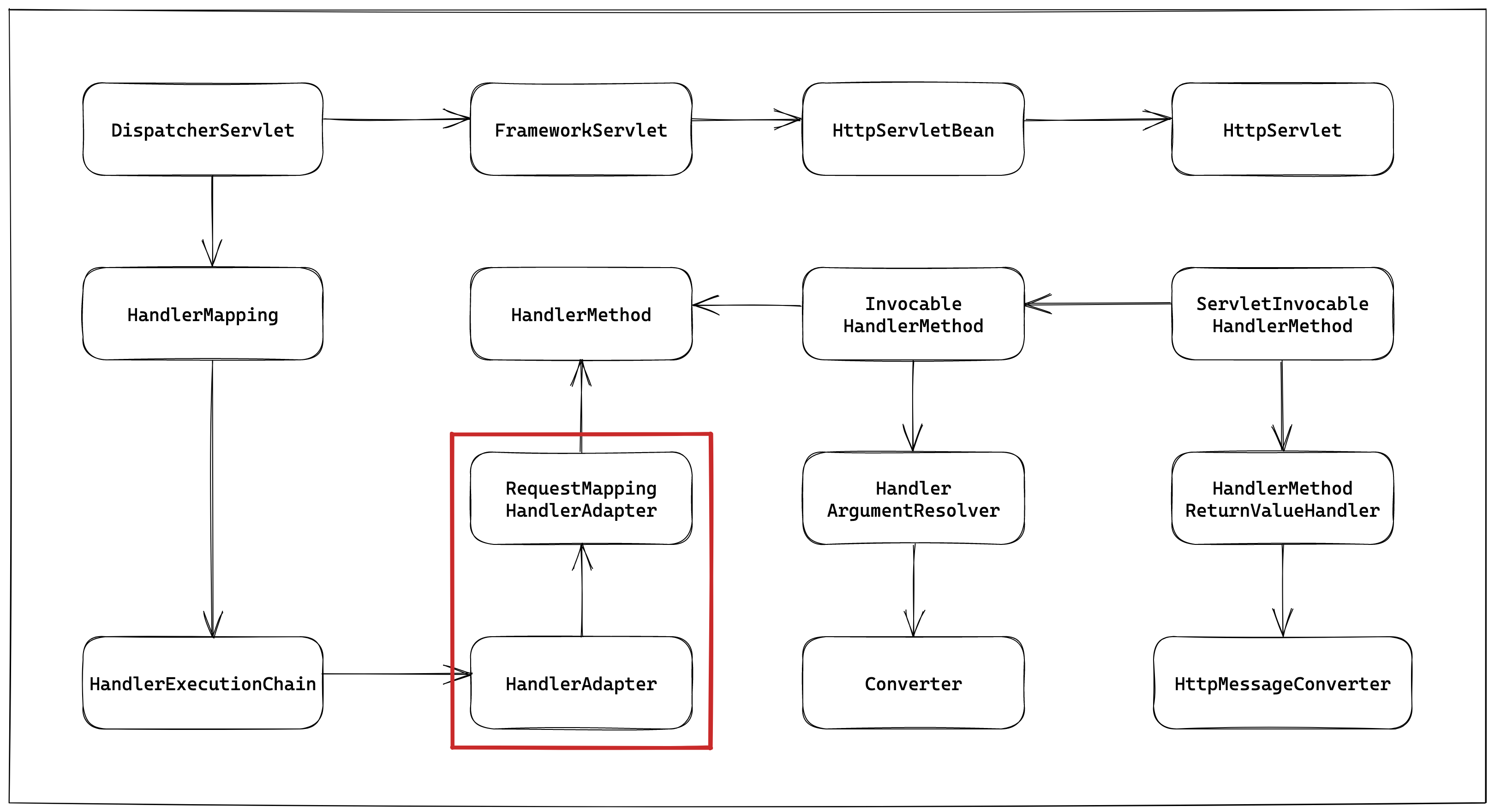 HandlerAdapter도 마찬가지로 받아온 핸들러(handler)를 지원하는 HandlerAdapter를 찾아 반환한다.