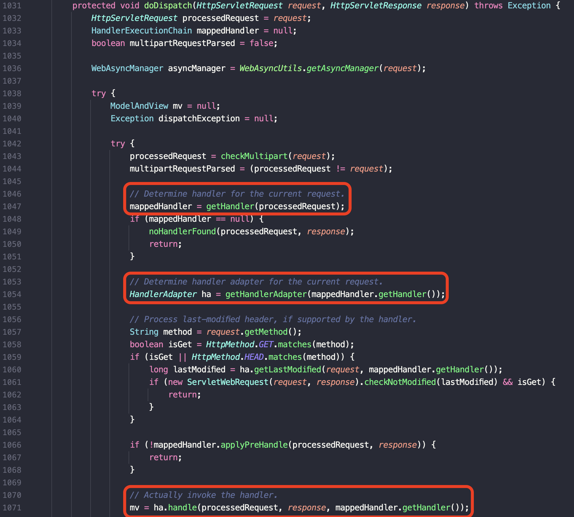 doDispatch()의 메서드 내부를 보면 크게 몇 가지 볼 수 있다.
