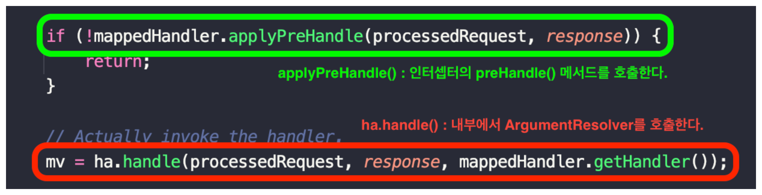 실행 체인에 등록된 인터셉터들의 preHandle() 메서드를 각각 호출하게 되고 하나라도 false를 반환할 시에 doDispatch() 메서드가 종료된다.
