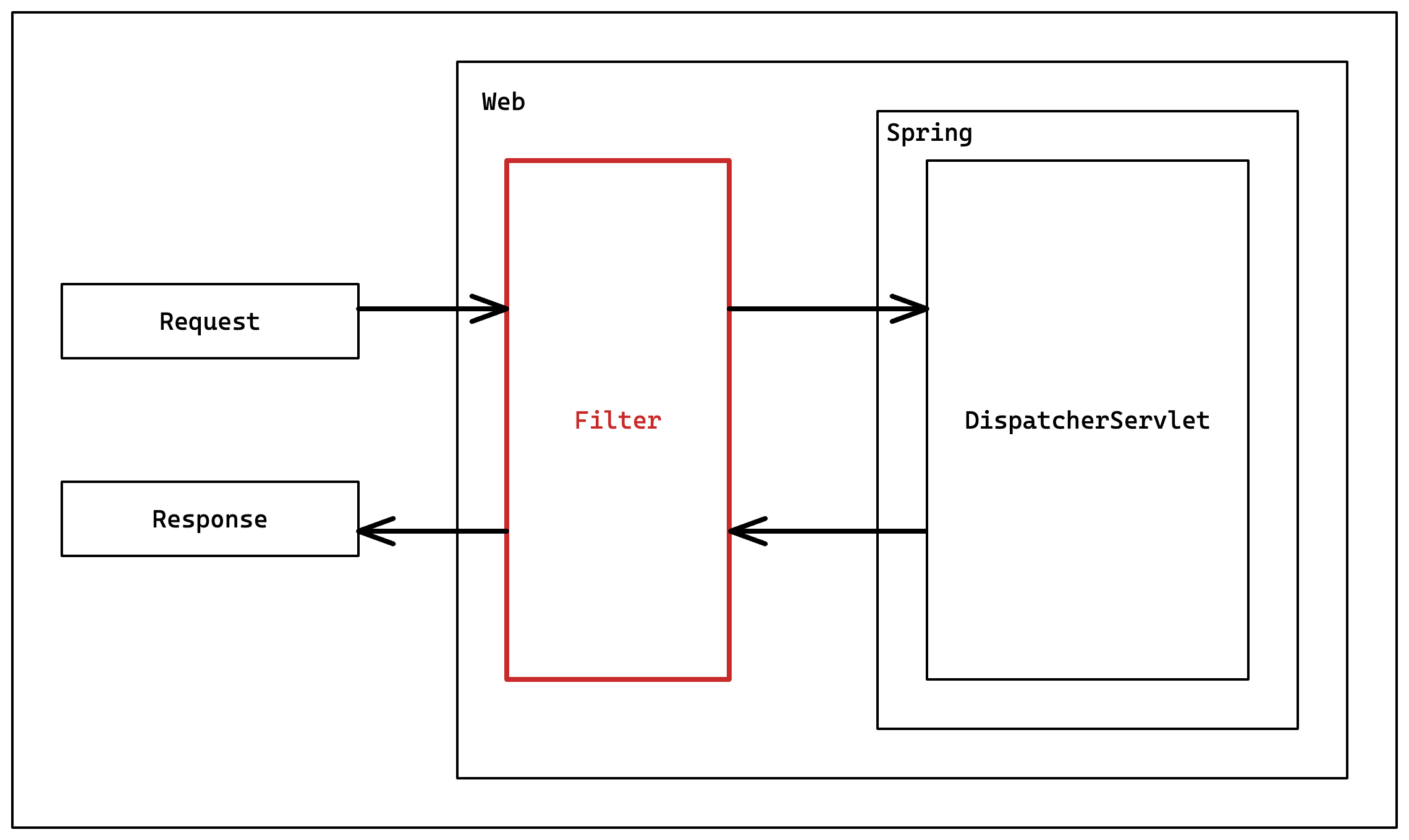 그림을 보면 알 수 있듯이 스프링 컨테이너가 필터를 관리하지 않고 웹 컨테이너가 관리하고 있다.