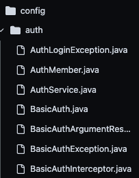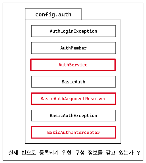 실제 빈 등록 정보가 있는 클래스는 AuthService, BasicAuthArgumentResolver, BasicAuthInterceptor입니다.