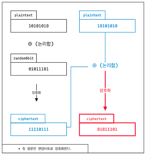 - 첫 번째 평문만 랜덤비트로 논리합을 수행하여 암호화한다.