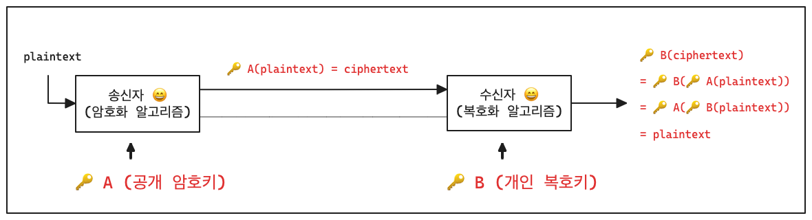 공개키🔑(public key)만으로암호문(ciphertext)을평문(plaintext)으로 복호화할 수 없다.- 하지만 침입자가
