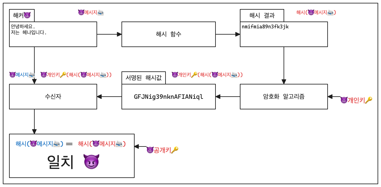 해커는 😈메세지📨를 해커의 😈공개키🔑, 😈개인키🔑를 이용해서 송신한다.
