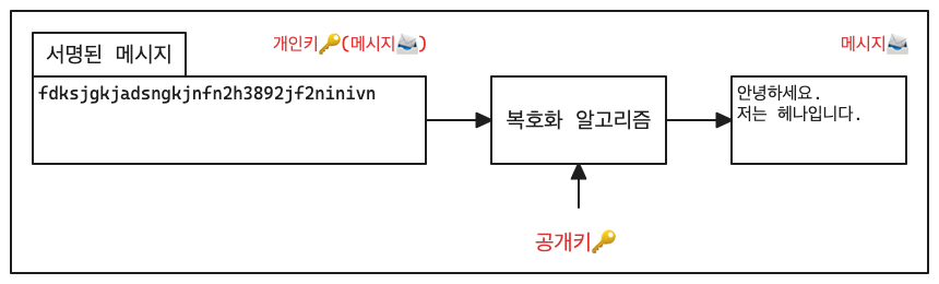 이제 확장 메시지 = (메시지📨, 개인키🔑(해시(메시지📨)))를 송신한다.