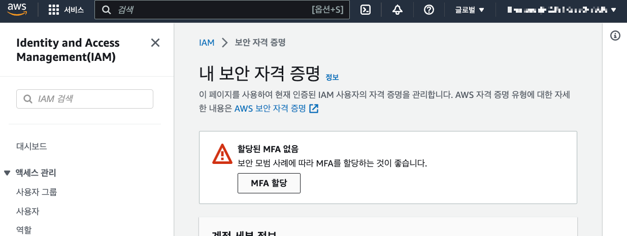 계정을 클릭하여 보안 자격 증명(My Security Credentials)에 들어온다.