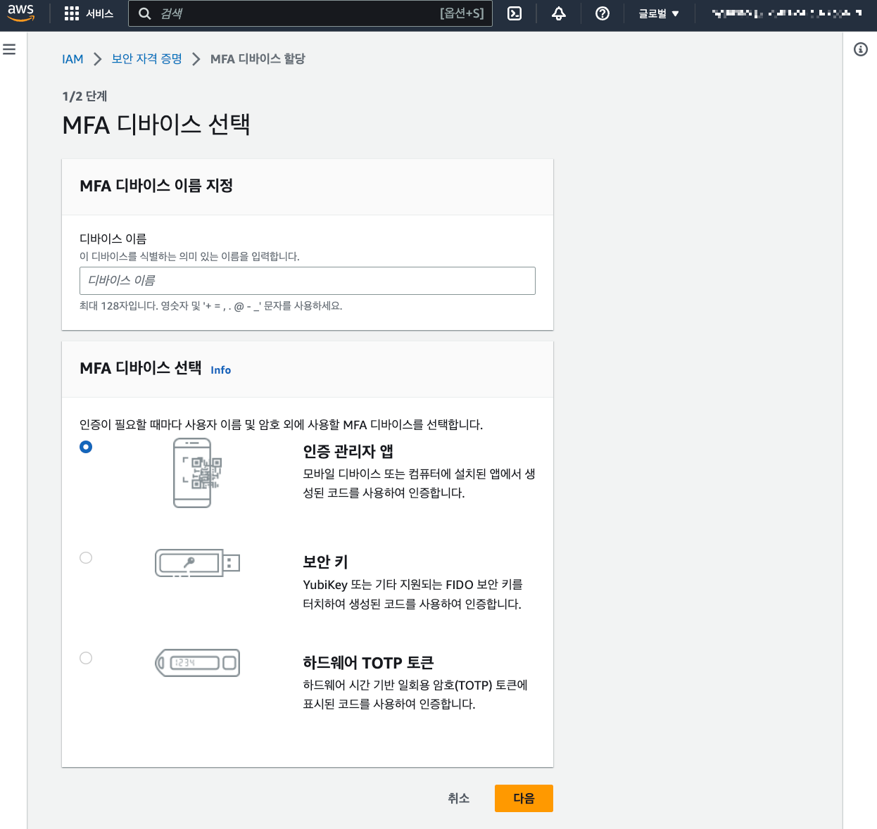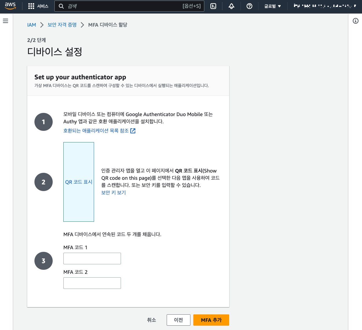 - MFA를 사용하는 사용자가 웹 로그인을 하는 경우 "사용자 이름과 암호" + "MFA 디바이스 인증"을 입력한다.