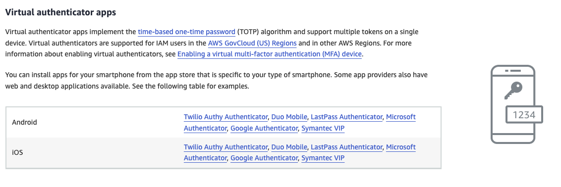 다음과 같이 디바이스를 통해서 인증해줘야 하는데 어떤 앱을 설치할지는 아래 AWS 공식 페이지에서 알려주는 앱을 이용하자.