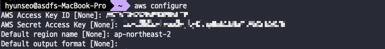 이제 터미널(Terminal)에 들어가서 "aws configure"라는 명령어를 입력해서 액세스 키 정보를 등록하자.