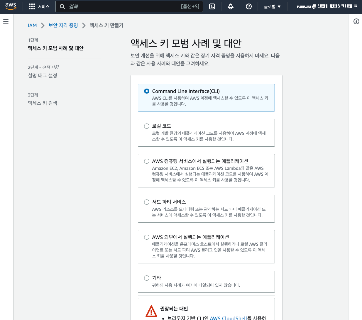 우리는 AWS CLI에 접근하기 위한 액세스 키를 만들어볼 예정이니 Command Line Interface(CLI)를 선택하면 된다.
