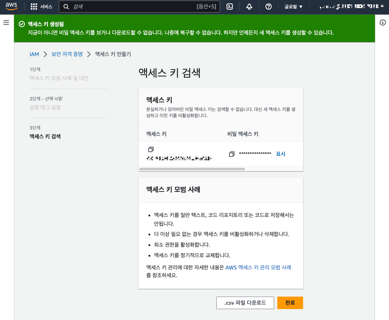 액세스 키는 비밀번호와 같은 역할을 하고 있으므로 생성한 이후에 다른 사용자에게 노출되지 않도록 주의하자.