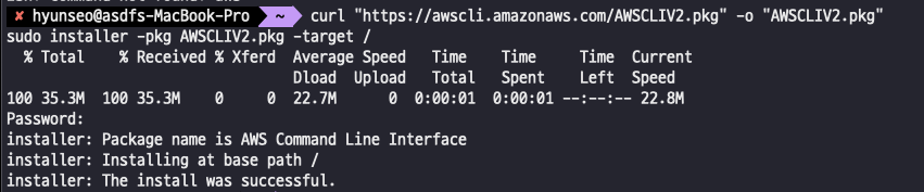 sudo installer -pkg AWSCLIV2.pkg -target /