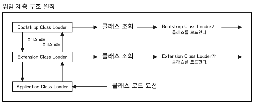- 실패할 경우 확장 경로($JAVA_HOME/jre/lib/ext)의 확장 디렉터리에서 클래스를 로드합니다.