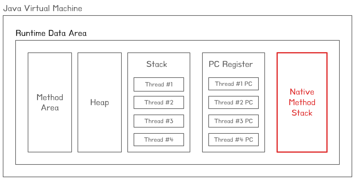 각 JVM 스레드에 대해 스레드가 시작되면 현재 실행 중인 명령의 주소(메서드 영역의 메모리 주소)를 유지하기 위해 별도의 PC 레지스터가 생성됩니다.