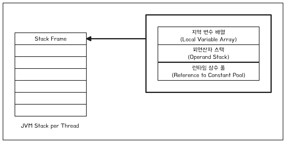 각 스택 프레임에는 실행 중인 메서드가 속한 클래스의 지역 변수 배열, 피연산자 스택 및 런타임 상수 풀에 대한 참조 정보가 있습니다.
