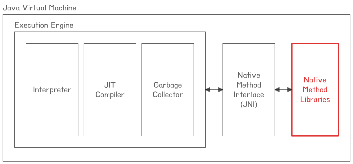 네이티브 라이브러리의 기능을 제공하기 위해 사용되어지며 이를 통해서 JVM은 하드웨어에 고유한 C/C++ 라이브러리에서 호출할 수 있습니다.