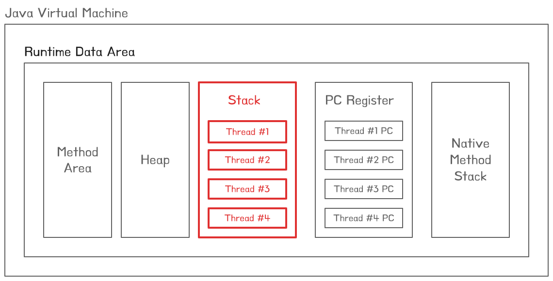 스택 영역은 공유 리소스가 아닌 JVM 스레드에 대해서 스레드가 시작되면 각 메서드 호출을 저장하기 위해서 별도로 스택이 생성됩니다.